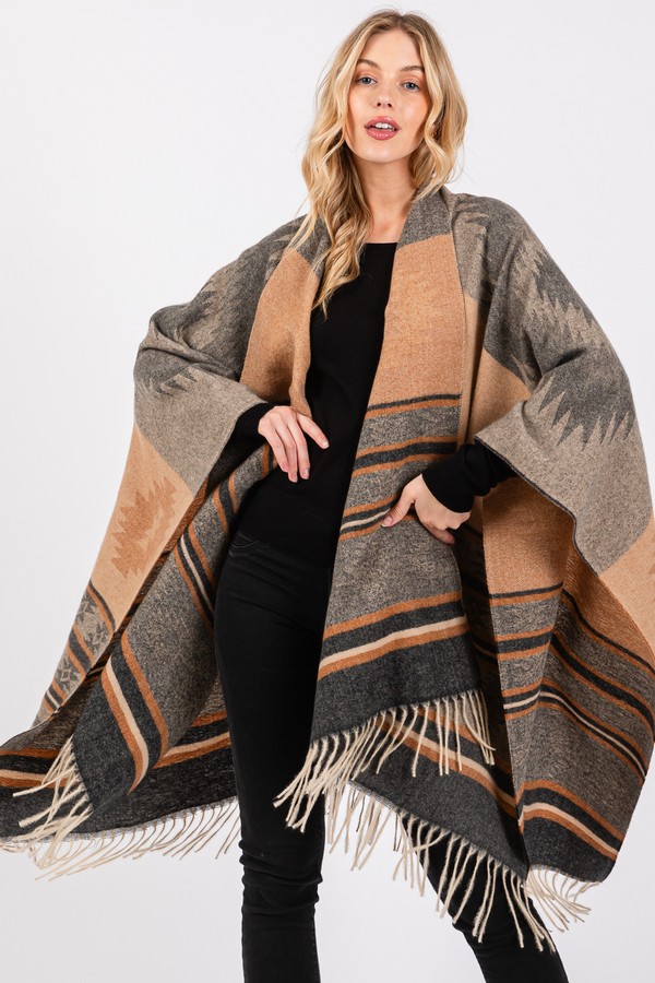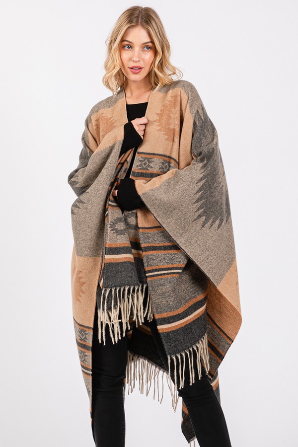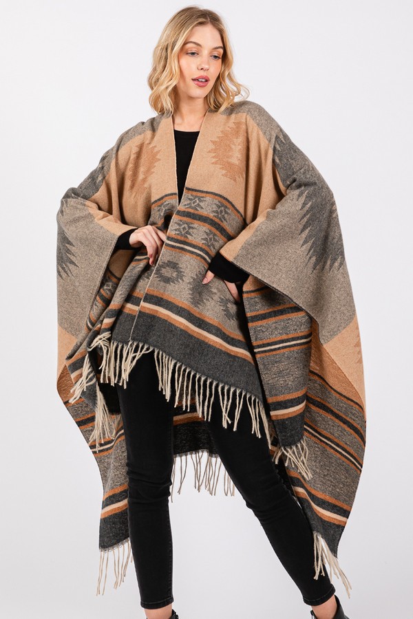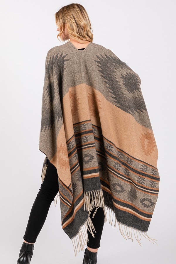 - * Elevate your winter wardrobe with the Aztec Pattern Fringe Ruana from H&D Accessories! This poncho features a beautiful Aztec pattern and fringe detail for a touch of bohemian flair.