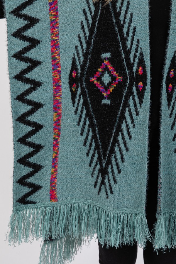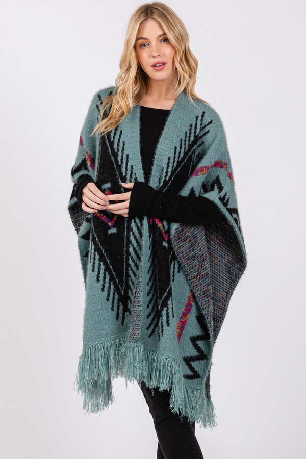 - * Fuzzy Aztec Pattern Tassel Knit Ruana