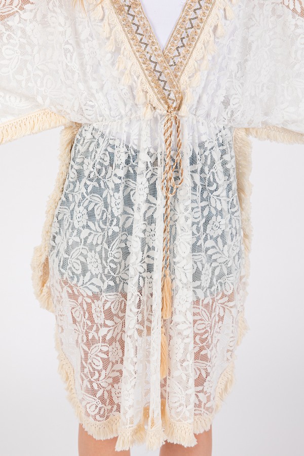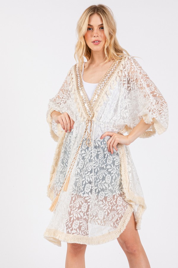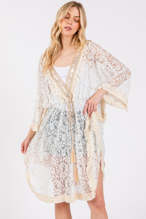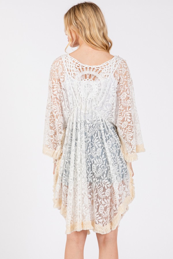 - * Introducing the Flower Lace Tassel Kimono – a stunning white dress that combines elegance and bohemian charm. With its delicate lace design and fringed hem, this cover-up is perfect for any occasion, whether you're at the beach or enjoying a summer festival. Elevate your wardrobe with this must-have piece from H&D Accessories.