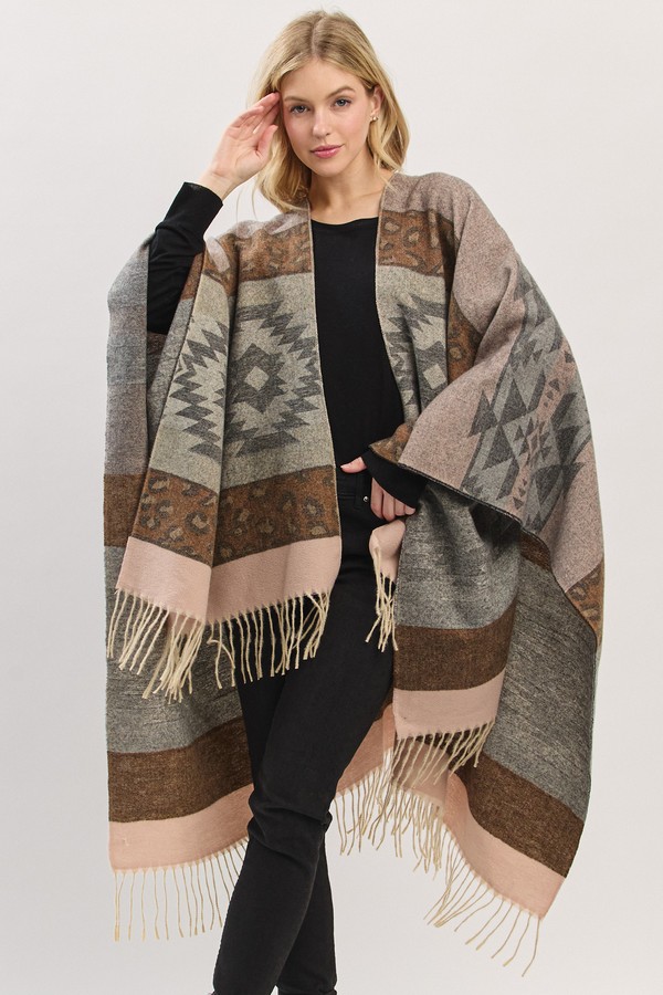 - * The product is an Aztec Leopard Pattern Fringe Ruana from H&D Accessories. It features a unique combination of Aztec and leopard patterns, creating a stylish and eye - catching design. The ruana has a loose, open - front style with fringes along the edges, adding a bohemian touch. It is perfect for adding a fashionable and cultural flair to casual outfits, suitable for occasions like outdoor festivals, casual gatherings, or as a cozy layer on cooler days.