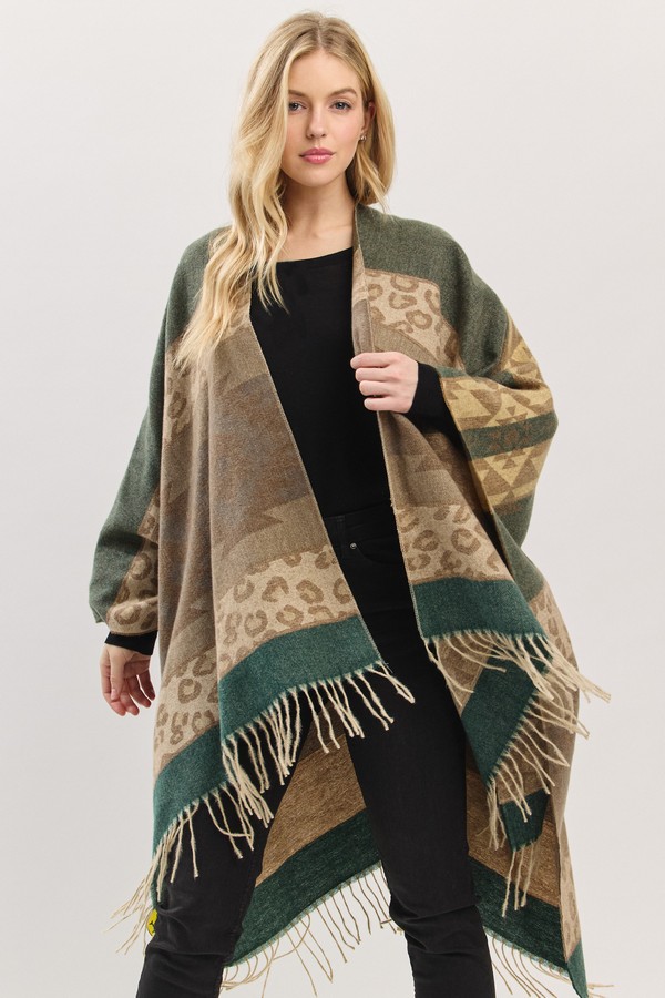 - * The product is an Aztec Leopard Pattern Fringe Ruana from H&D Accessories. It features a unique combination of Aztec and leopard patterns, creating a stylish and eye - catching design. The ruana has a loose, open - front style with fringes along the edges, adding a bohemian touch. It is perfect for adding a fashionable and cultural flair to casual outfits, suitable for occasions like outdoor festivals, casual gatherings, or as a cozy layer on cooler days.