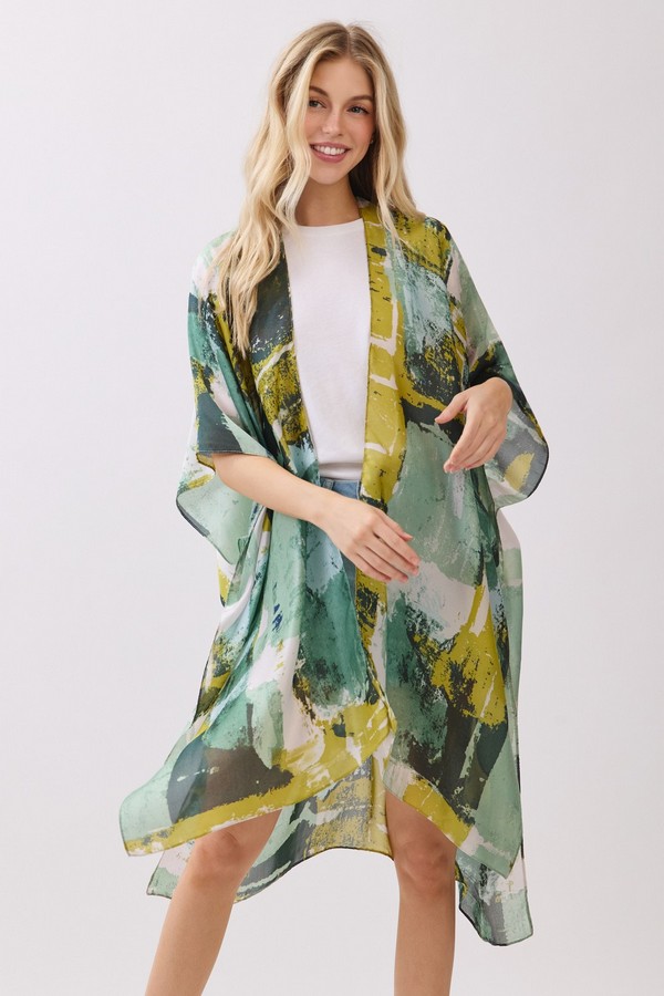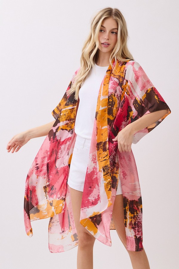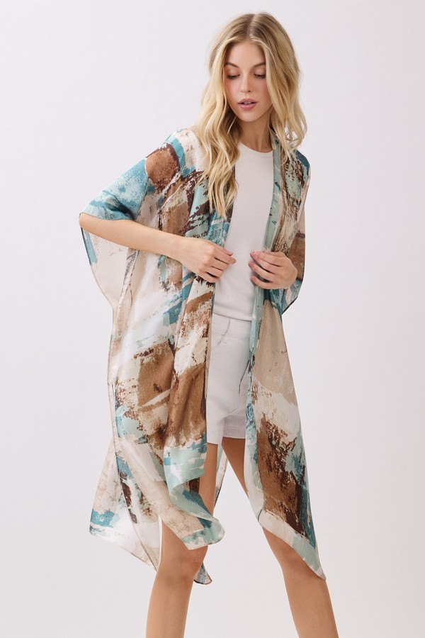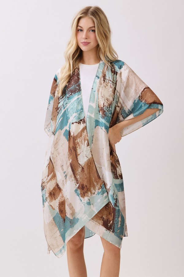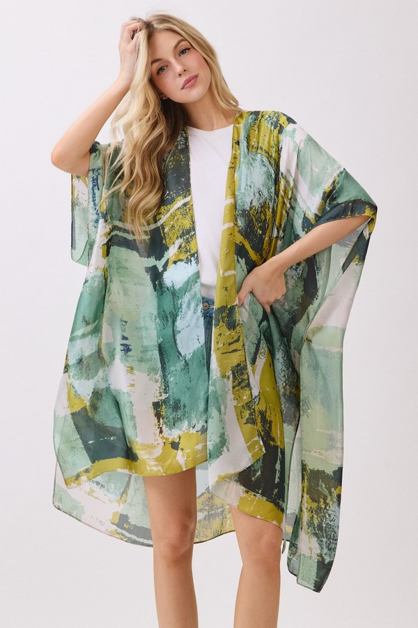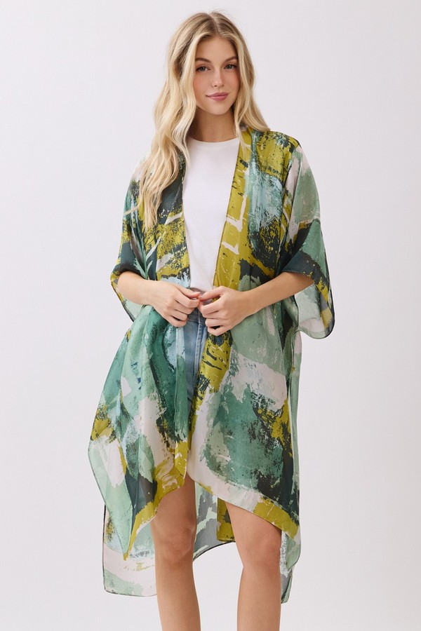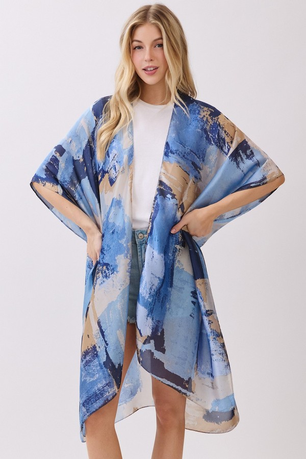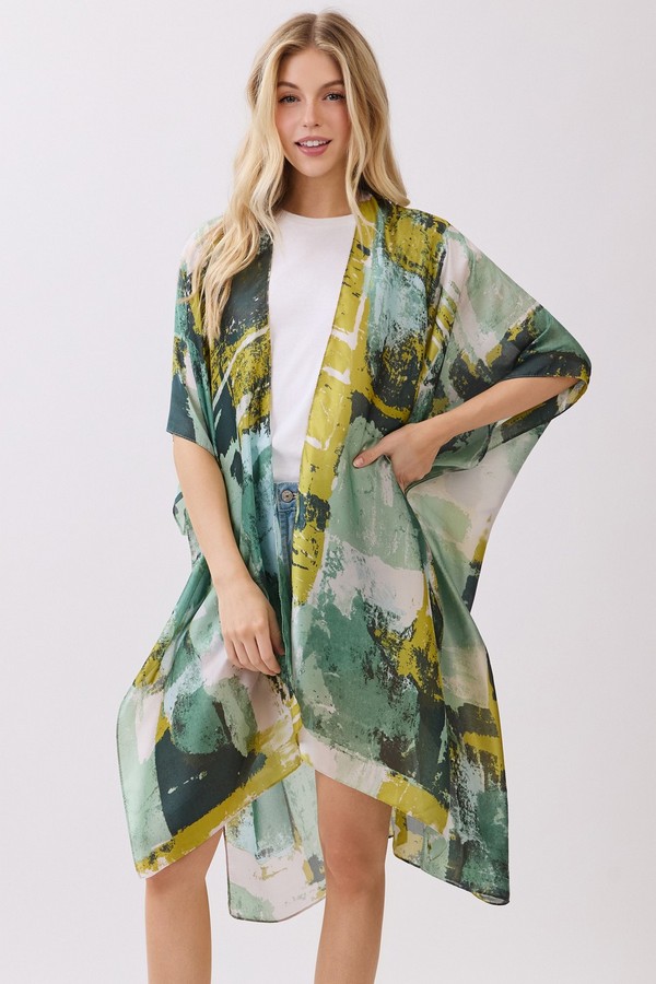 - * This Abstract Modern Art-Inspired Print Silky Feel Kimono from H&D Accessories features a fluid, lightweight silhouette with an open front and elbow-length sleeves, designed for effortless layering. The breezy, draped cut and smooth fabric make it ideal for elevating a casual jeans-and-tee look on weekend outings, or adding a polished finish to a sundress for a beachside brunch. It drapes beautifully to create a relaxed, sophisticated silhouette that transitions seamlessly from day to evening.