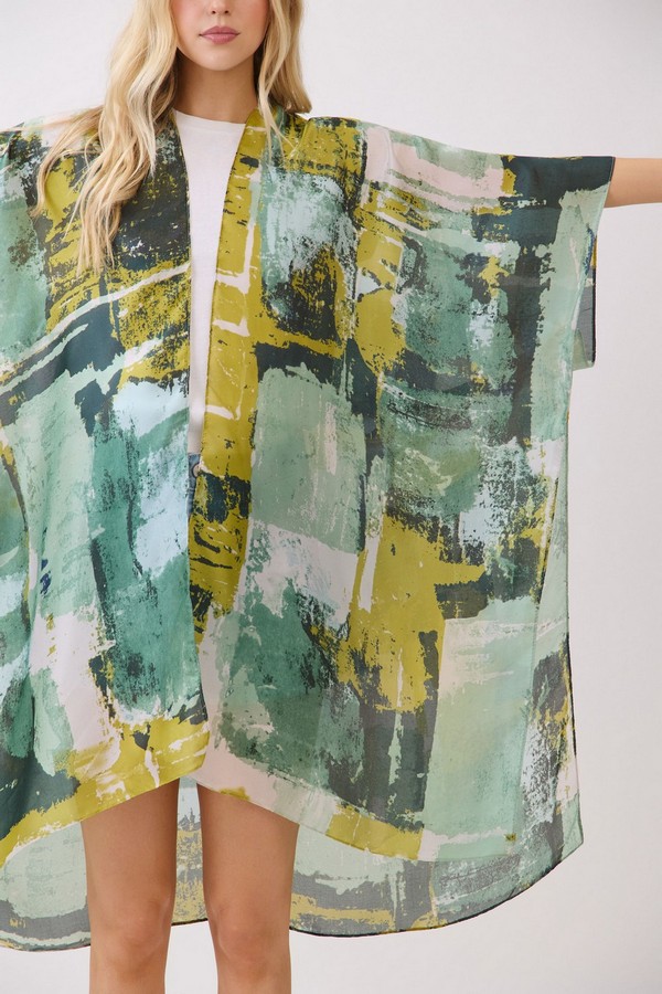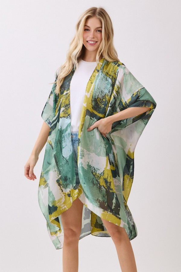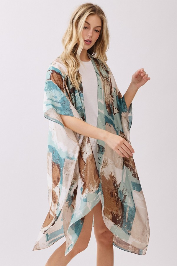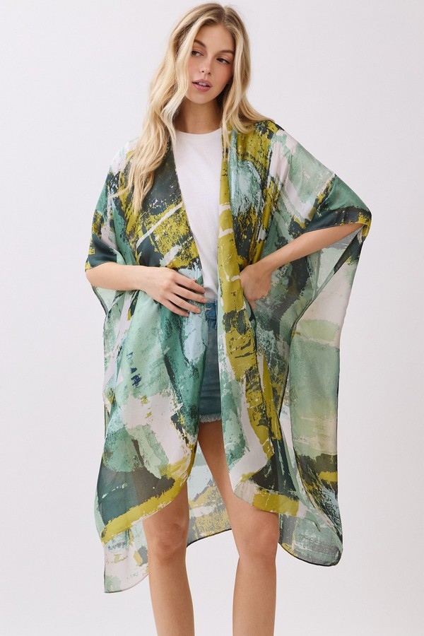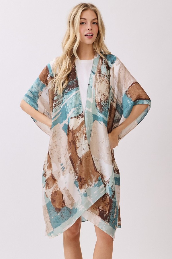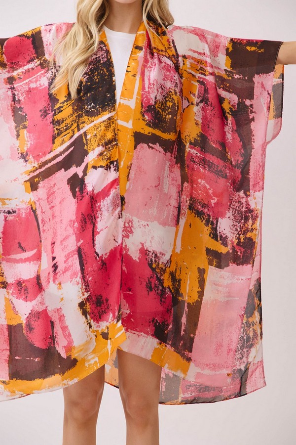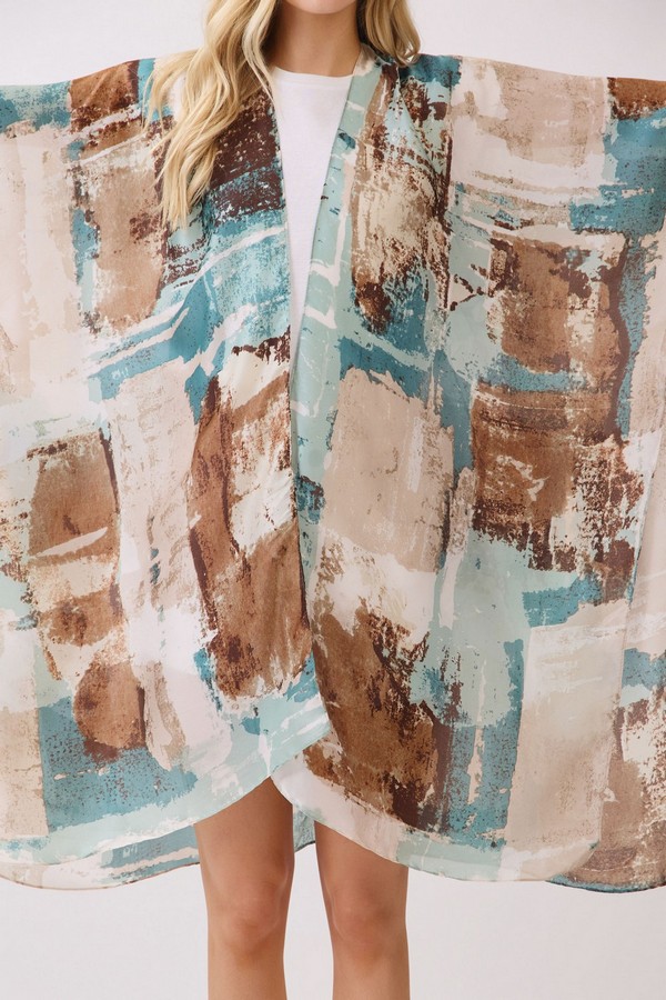 - * This Abstract Modern Art-Inspired Print Silky Feel Kimono from H&D Accessories features a fluid, lightweight silhouette with an open front and elbow-length sleeves, designed for effortless layering. The breezy, draped cut and smooth fabric make it ideal for elevating a casual jeans-and-tee look on weekend outings, or adding a polished finish to a sundress for a beachside brunch. It drapes beautifully to create a relaxed, sophisticated silhouette that transitions seamlessly from day to evening.