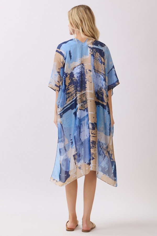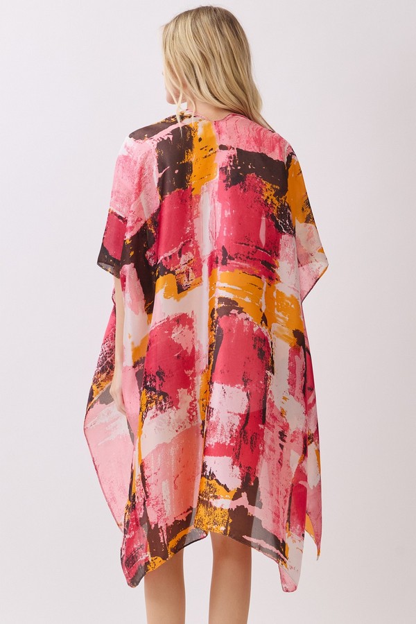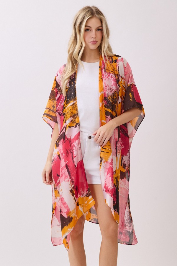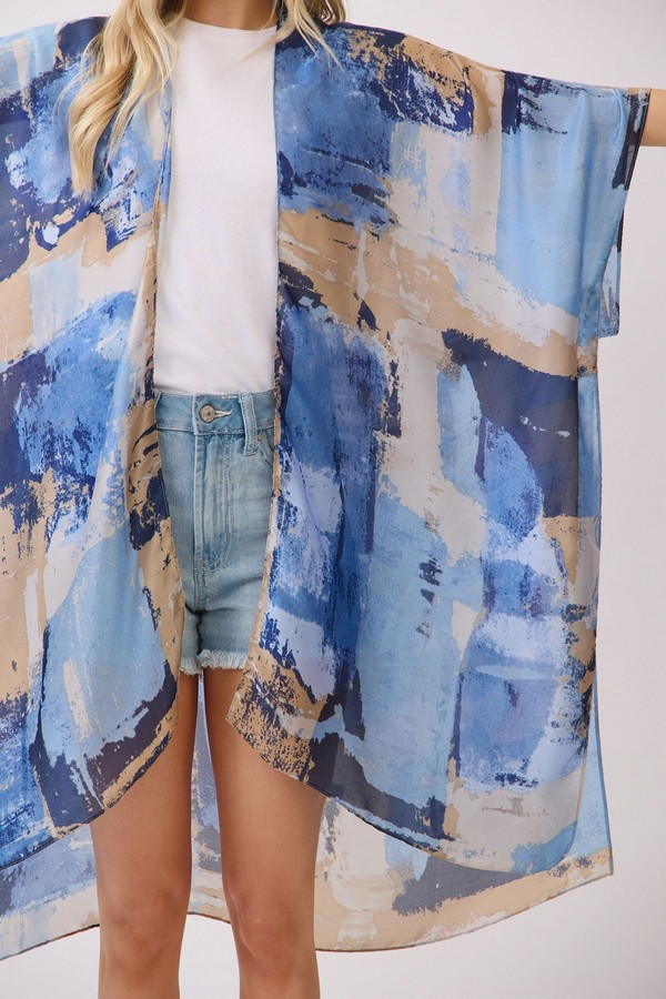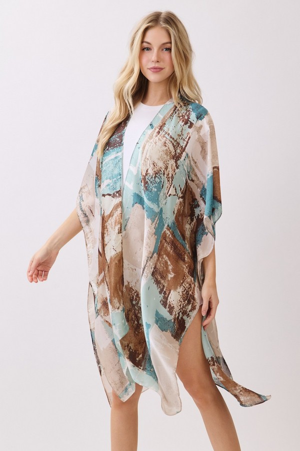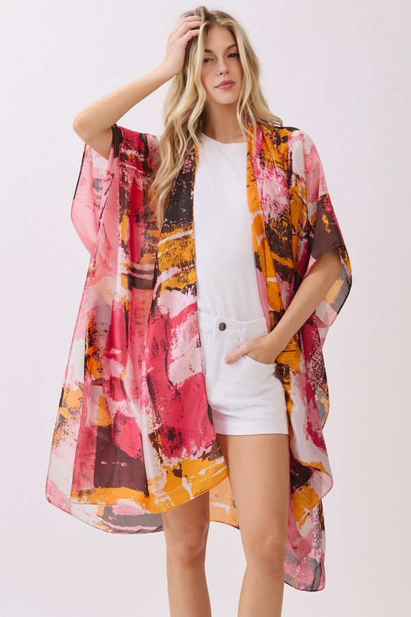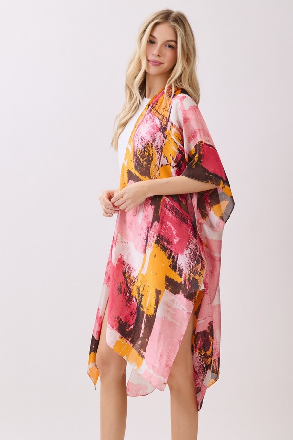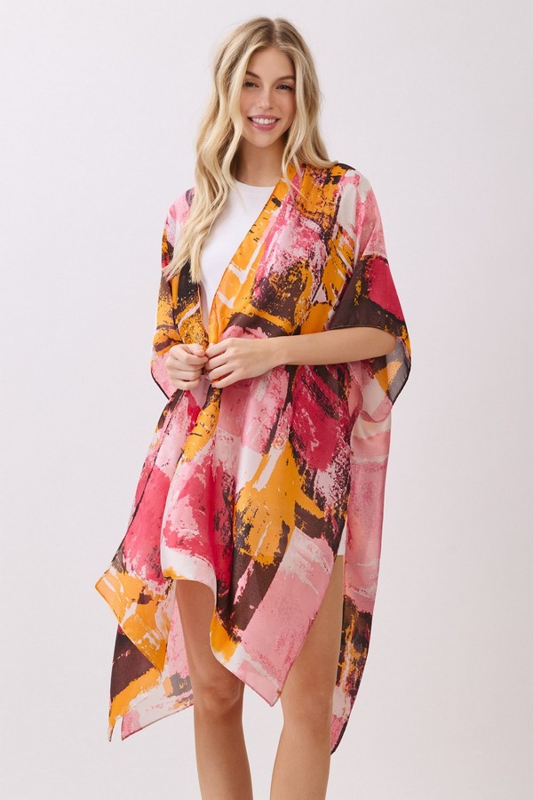 - * This Abstract Modern Art-Inspired Print Silky Feel Kimono from H&D Accessories features a fluid, lightweight silhouette with an open front and elbow-length sleeves, designed for effortless layering. The breezy, draped cut and smooth fabric make it ideal for elevating a casual jeans-and-tee look on weekend outings, or adding a polished finish to a sundress for a beachside brunch. It drapes beautifully to create a relaxed, sophisticated silhouette that transitions seamlessly from day to evening.