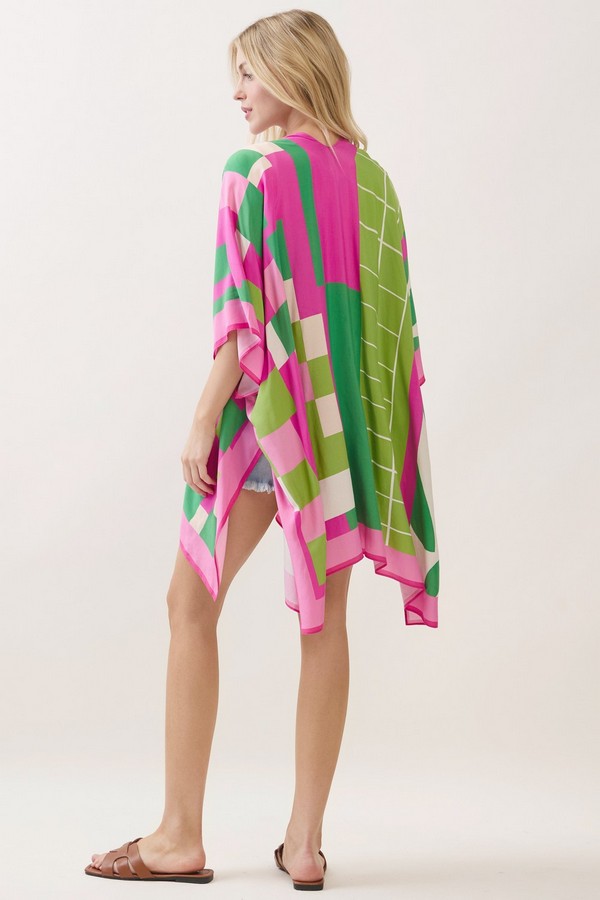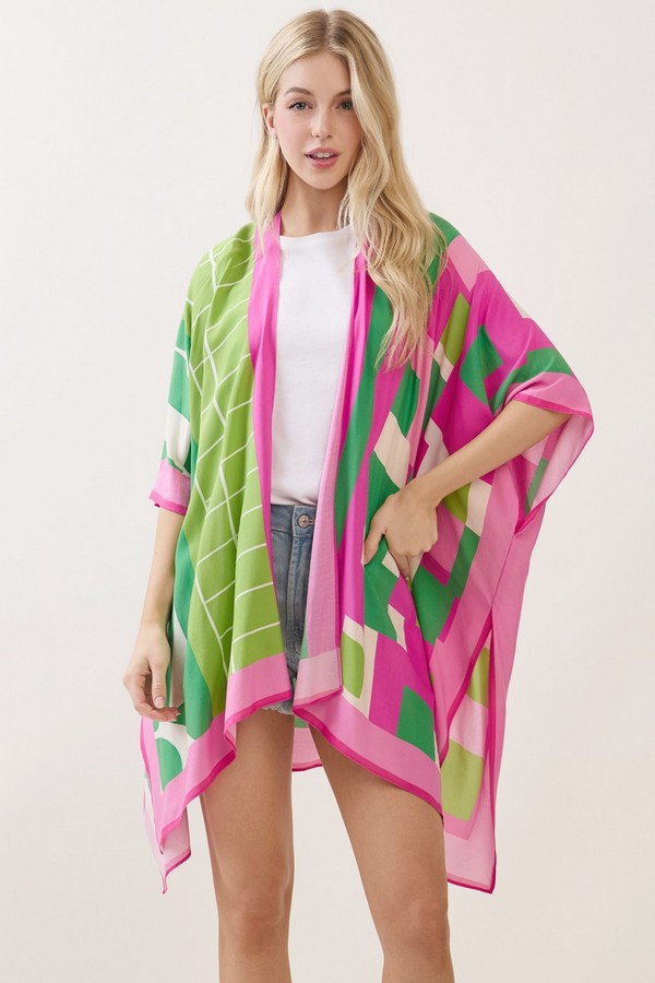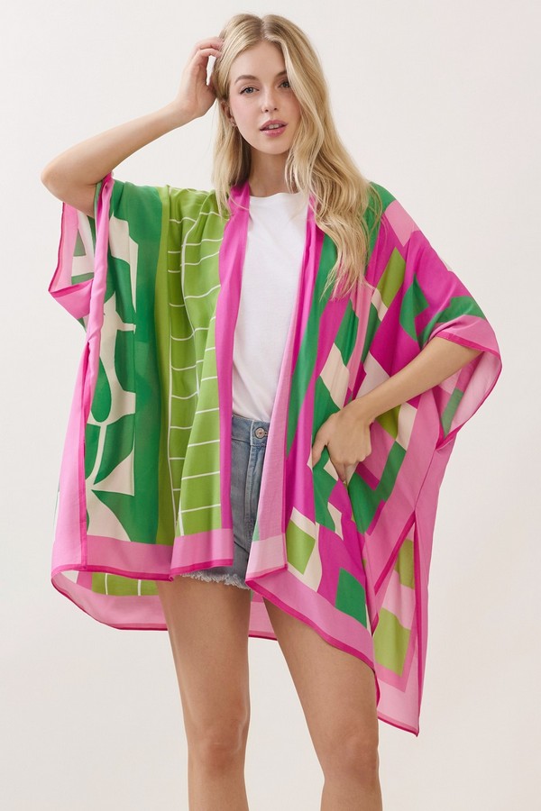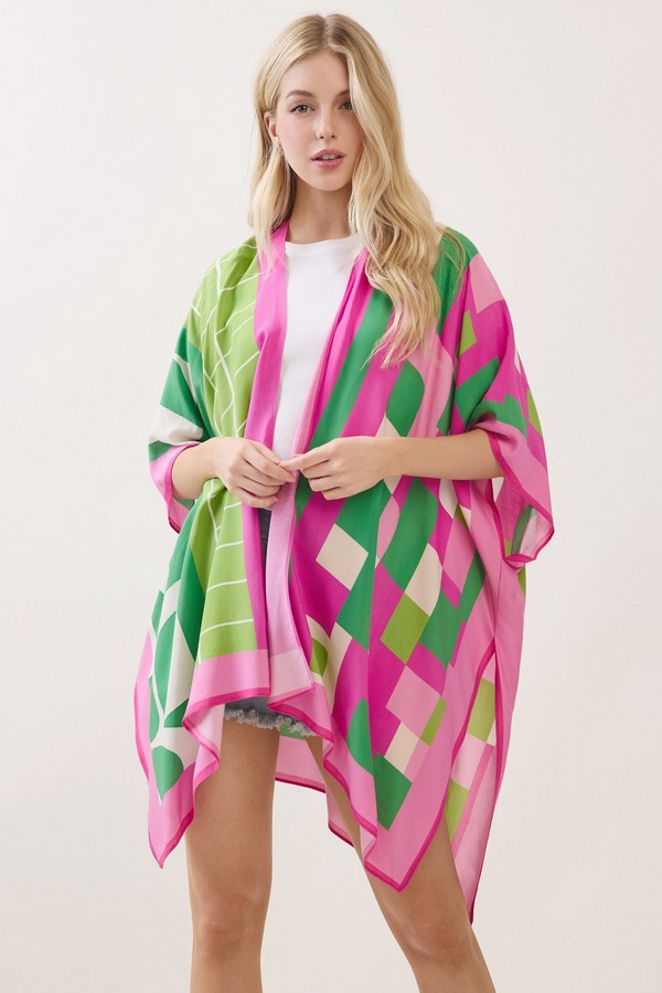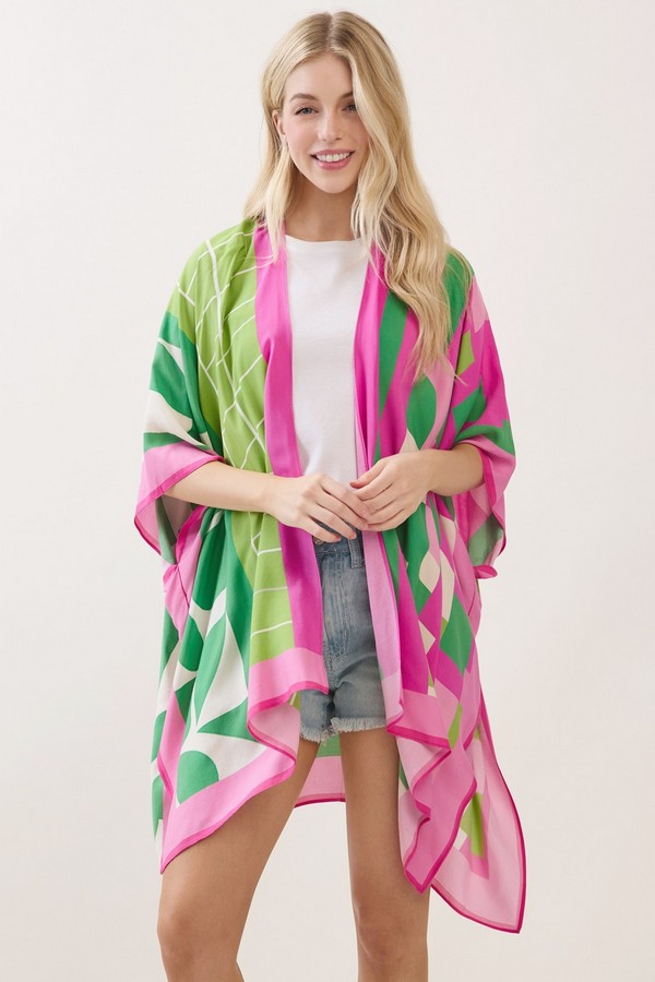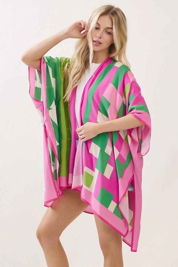 - * This Geometric Print Kimono from H&D Accessories is made of lightweight, flowy fabric with a smooth, silky touch, featuring a vibrant geometric print with bold contrasting colors and graphic patterns. Its relaxed, open-front silhouette makes it a versatile layering piece, perfect as a breezy cover-up for beach days, a chic addition to brunch outfits, or a stylish way to elevate casual everyday looks.